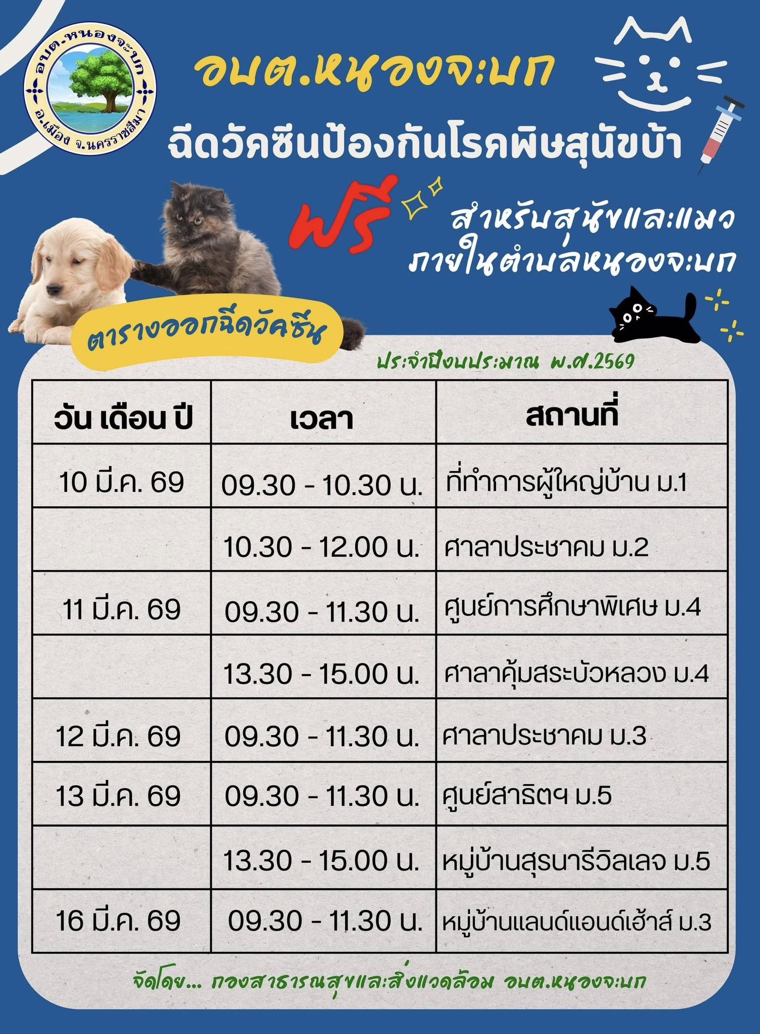 ขอเชิญนำสัตว์เลี้ยงรับบริการฉีดวัคซีนป้องกันโรคพิษสุนัขบ้า ประจำปีงบประมาณ พ.ศ.2569 ฟรีไม่มีค่าใช้จ่ายองค์การบริหารส่วนตำบลหนองจะบก ขอเชิญชวนประชาชนในพื้นที่ตำบลหนองจะบก นำสุนัขและแมวที่ท่านเลี้ยง มารับบริการฉีดวัคซีนป้องกันโรคพิษสุนัขบ้า ฟรี ตามวัน เวลา และสถานที่ที่กำหนดไว้ในตารางแนบท้ายประกาศนี้การฉีดวัคซีนป้องกันโรคพิษสุนัขบ้า เป็นการช่วยลดความเสี่ยงในการแพร่ระบาดของโรค และสร้างความปลอดภัยให้กับทั้งสัตว์เลี้ยงและประชาชนในชุมชน อีกทั้งยังเป็นการร่วมกันสร้างภูมิคุ้มกันให้ครอบคลุมในพื้นที่อย่างยั่งยืน
