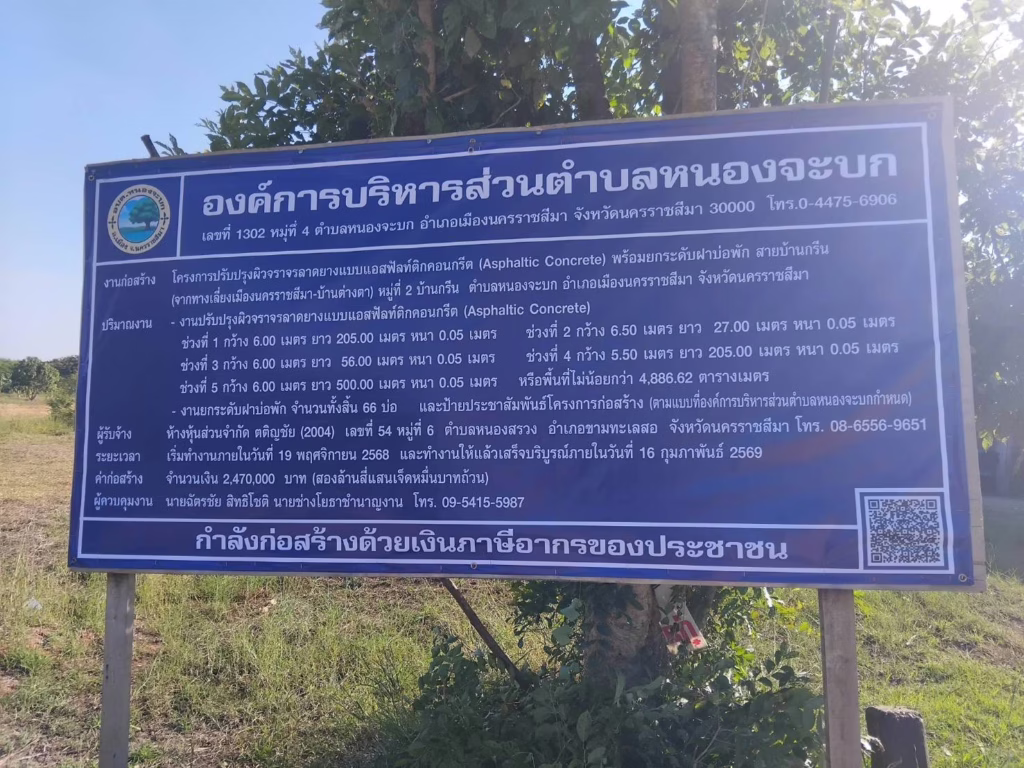ประชาสัมพันธ์ องค์การบริหารส่วนตำบลหนองจะบก ดำเนินโครงการปรับปรุงผิวจราจรลาดยางแบบแอสฟัลท์ติกคอนกรีต พร้อมยกระดับฝาบ่อพัก สายบ้านกรีน (จากทางเลี่ยงเมืองนครราชสีมา – บ้านต่างตา) หมู่ที่ 2 บ้านกรีน ตำบลหนองจะบก อำเภอเมืองนครราชสีมา จังหวัดนครราชสีมา ปริมาณงานประกอบด้วย งานปรับปรุงผิวจราจรลาดยางแบบแอสฟัลท์ติกคอนกรีต (Asphaltic Concrete)
